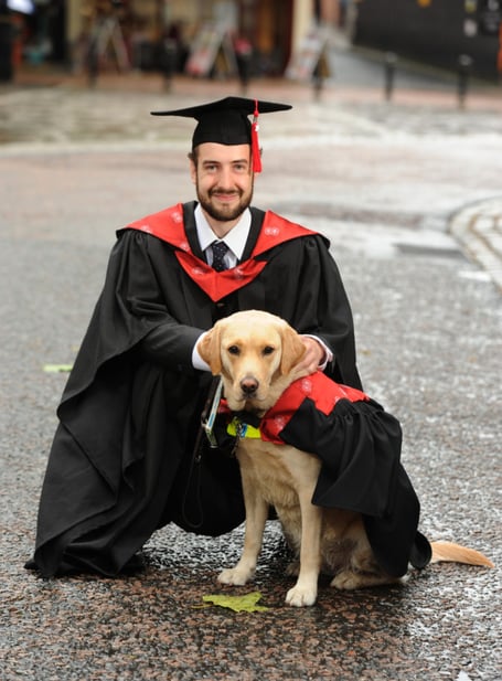 A university student from Peel was almost upstaged by his guide dog when they attended his graduation ceremony.
