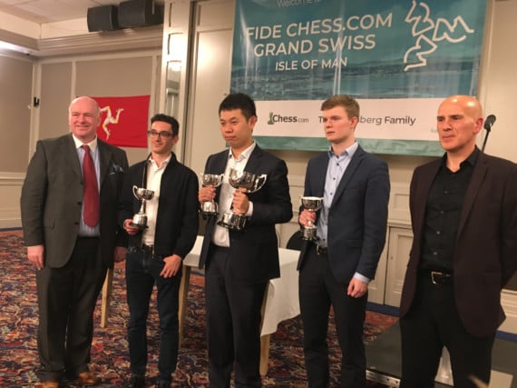 Left to right: Chief Minister Howard Quayle, Fabiano Caruana (USA), Wang Hao (China), Kirill Alekseenko (Russia) and Alan Ormsby tournament director