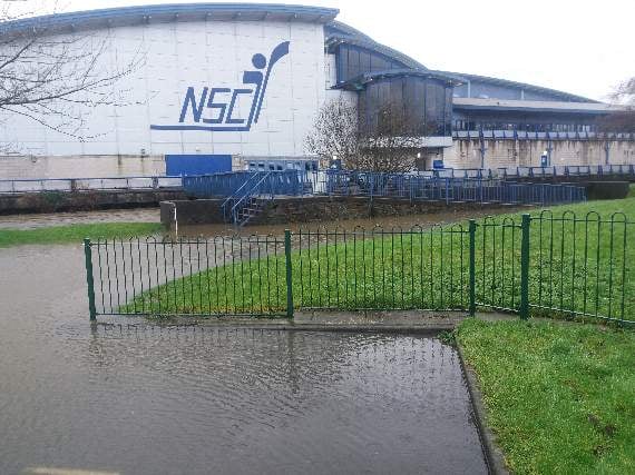 The National Sports Centre has been forced to close for the remainder of the day, as a precaution, because of the risk of flooding posed by the volume of water in the rivers Dhoo and Glass.