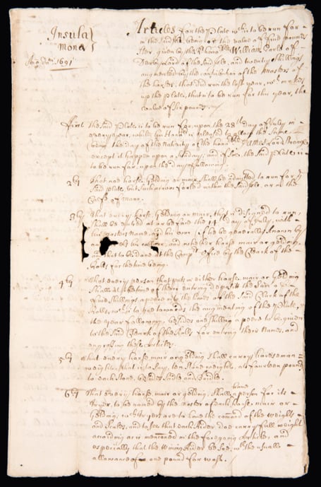 The lot that is coming up for auction with Graham Budd Auctions in London on November 13 comprises ’a group of three extremely rare and early horse racing manuscripts outlining in detail the Rules for the ’Manx Derby’ on the Isle of Man for the years 1691, 1692 and 1693’.